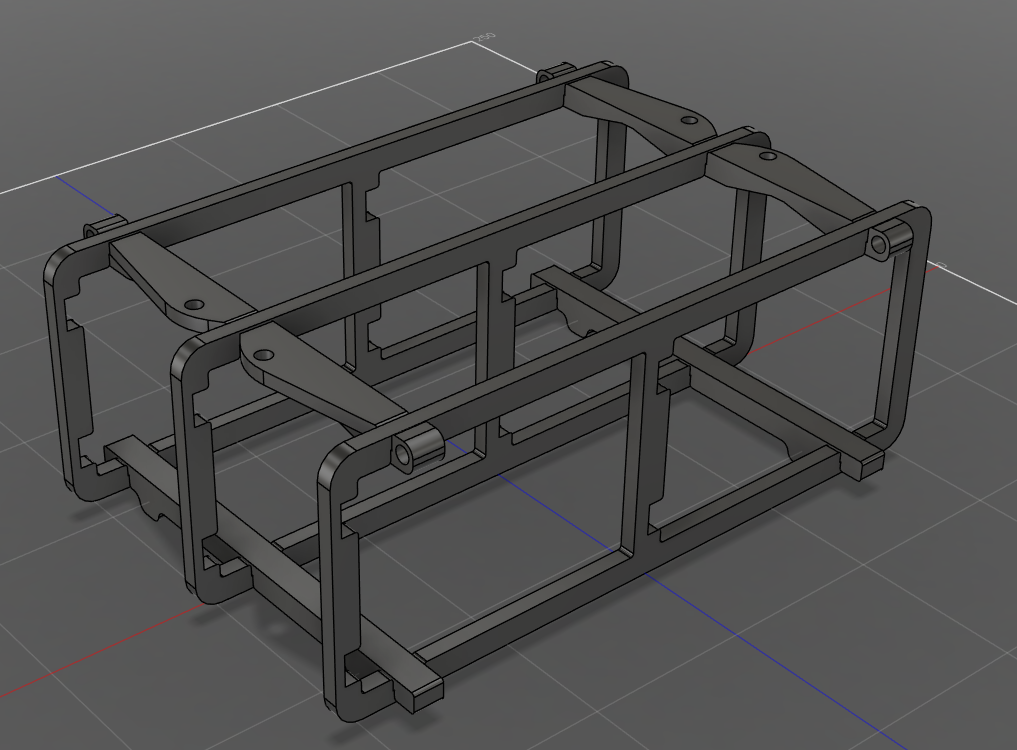 Der Rahmen ist komplett 3D Gedrückt, wobei die Grundkonstruktion nur gesteckt ist und durch das reinschieben der Akkus gehalten wird. So konnte ich an den Außenkanten mit nur 5mm Dicke Drucken und die 3D Drucke entlang der Stresspunkte ausrichten ohne Schrauben verwenden zu müssen.